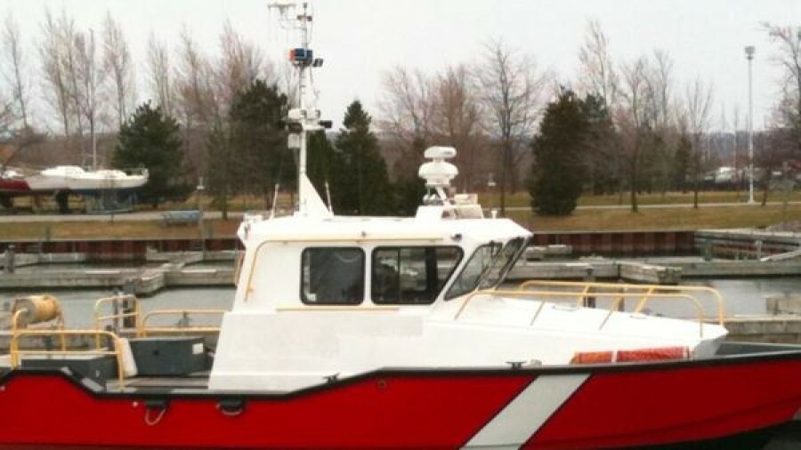 Red steel hull; white steel non-skid decks; helm seat; companion seat; transom door; bow pulpit & rails; swim platform; swim ladder; hydraulic steering.